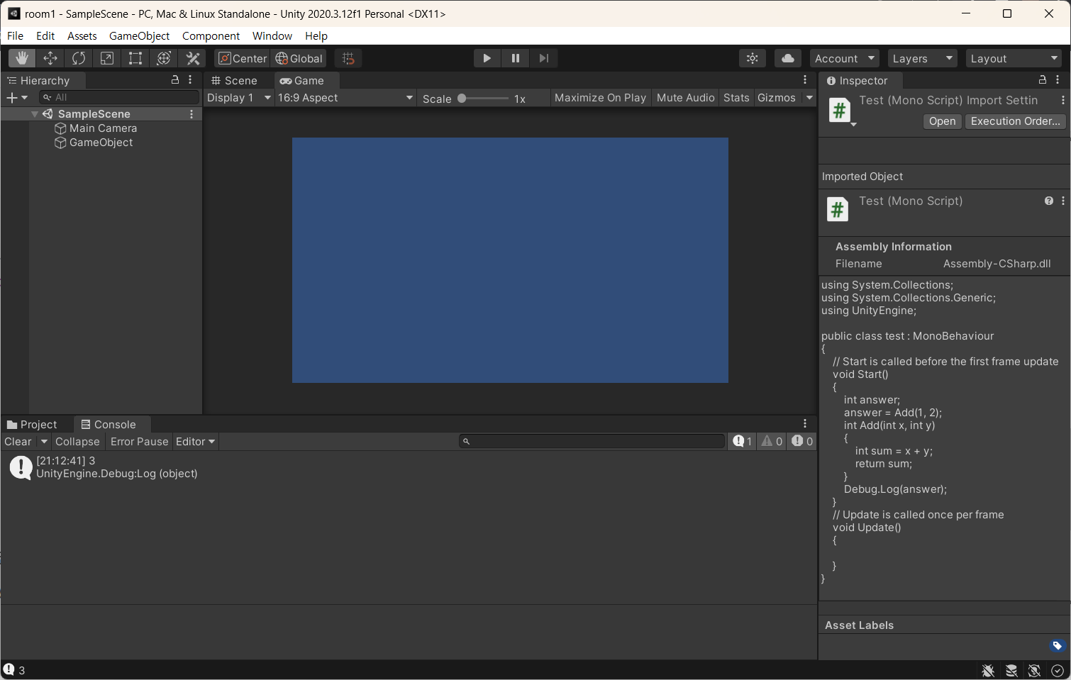 Debug.Log(answer); 를 통해 answer = Add(1, 2); 의 반환값이 콘솔창에 출력된 것이다.
