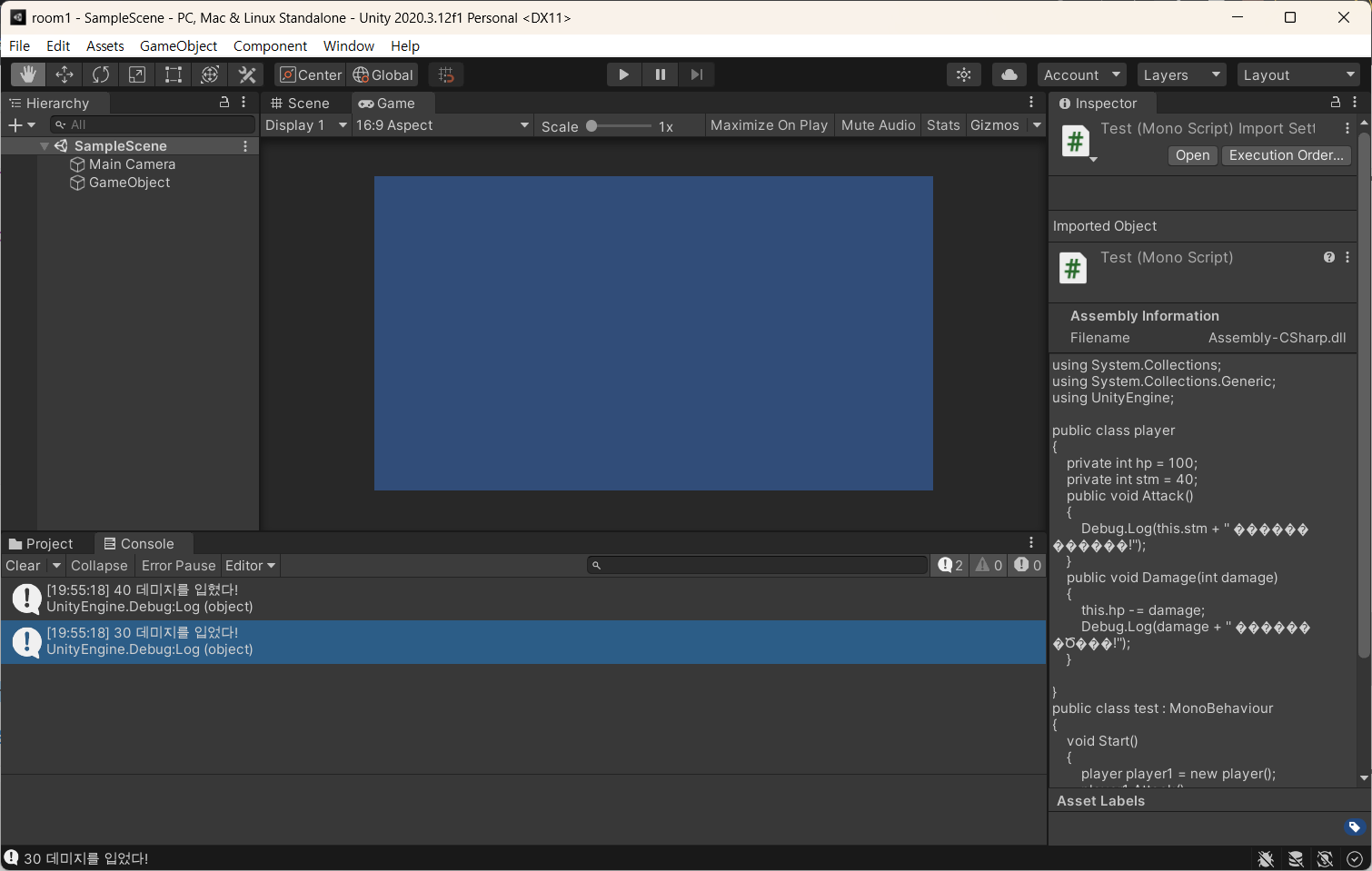 Debug.Log(damage + " 데미지를 입었다!");