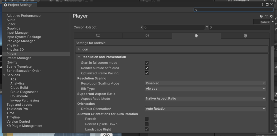 그럴땐 그냥 기본적으로 되어있는 Default Orientation를 Auto Rotation로 설정하고 게임씬에 있는 해상도 설정칸에서 아래와 같이 크기와 Landscape를 선택해주면 된다.