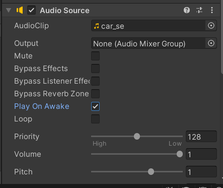 자동으로 체크되어 있는 Play On Awake 를 해제한다. (체크된 상태로 두면 게임 시작하자마자 재생된다.)