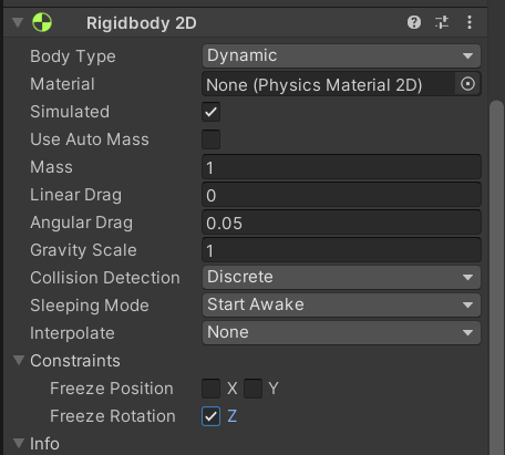 이를 방지하기 위해서는 Rigidbody 2D 설정에서 Constraints를 찾아 Freeze Rotation에서 Z를 체크해주면 된다.