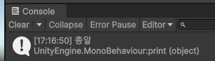 오브젝트에 해당 스크립트를 적용하면 콘솔창에 "총알" 이라고 뜬다.