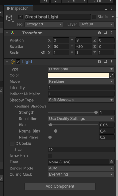 Directional Light 오브젝트에는 기본적으로 아래와 같이 Light 컴포넌트가 포함되어 있다.