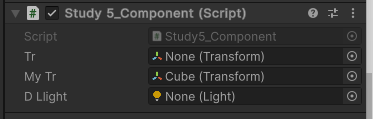 DLlight = tr.GetComponent<Light>(); // Directional Light 의 Light 컴포넌트를 가져와 변수에 할당한다.