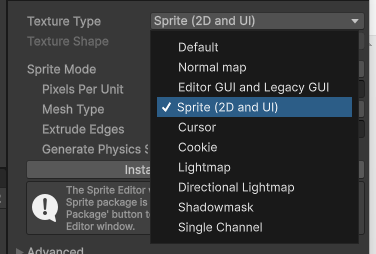 Sprite(2D and UI) 를 쓰면 이 스프라이트 타입을 2D와 UI에서 사용할 수 있다는 뜻이다.