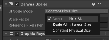 이를 예방하기 위해서는 UI를 생성할 때 자동으로 생성되는 부모 오브젝트인 Canvas의 인스펙터의 Canvas Scaler를 설정해주어야 한다.