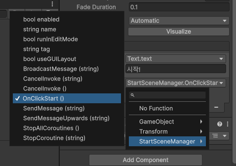 6. on click() 적용 후 Nu function 부분을 StartSceneManager 의 OnClickStart() 으로 선택해준다.