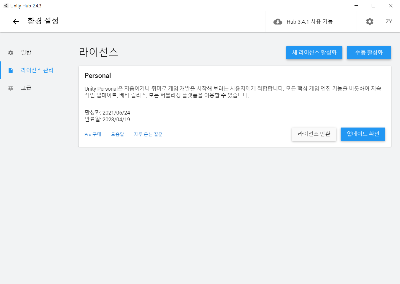 - [Unity hub] 실행하여 로그인 한 뒤 [새 라이선스 활성화] 를 선택한다.