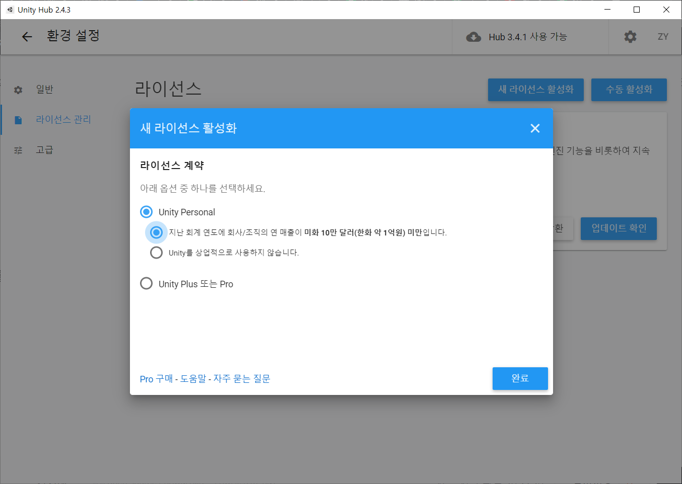 - Unity Personal 에서 [지난 회계 연도에 회사/조직의 연 매출이 10만 달러(한화 약 1억 원) 미만입니다.] 선택하여 완료한다.