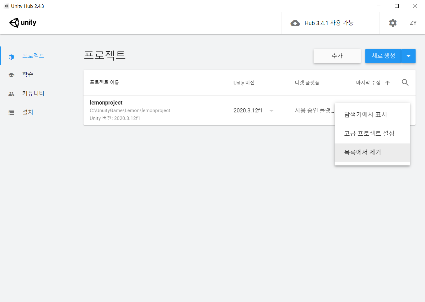 참고로 프로젝트는 목록에서 제거할 수도 있고, [추가]를 이용해 다시 추가할수도 있다.