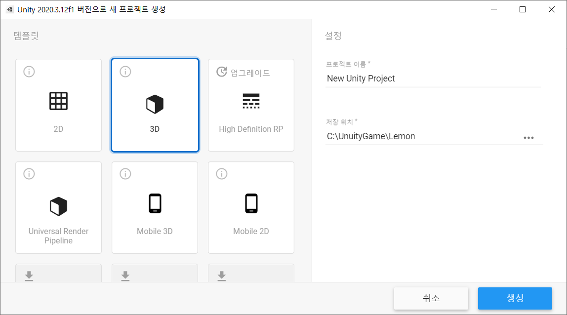 * 이때 저장위치는 모두 영문이어야 한다. [C:\사용자\Unity\study] 또는 [C:\UnityGame\스터디] 등 한글이 들어가면 100% 오류가 나므로 영어 이름의 파일을 만들어 놓고 생성한다.