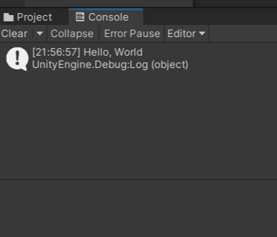- Console 창은 Unity에서 생성되는 오류, 경고, 기타 메시지를 표시한다.